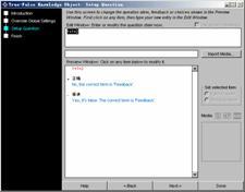 “add questions”這一步是進行添加練習(xí)測試題目的地方。在這一步里您可以添加7種題型:drag/drop(類似圖形拖拉選擇題)、hot object(類似圖形選擇題)、hot spot(類似區(qū)域選擇題)、multiple choice(多項選擇題)、short answer(簡答題)、single choice(單項選擇題)、true/false(是非判斷題)。選擇添加其中一種題型后,單擊【run wizard】按鈕將調(diào)出相應(yīng)題型的知識對象設(shè)置對話框,您可以進行題目的相關(guān)設(shè)置,包括題目內(nèi)容、正誤答案選項、答題選項提示等。圖6-5是true-false question(是非判斷題)知識對象設(shè)置對話框,只要簡單地輸入題目內(nèi)容、答案選項、回答提示等就可以完成一道練習(xí)測試題目的添加工作,返回后繼續(xù)添加其他新題目。各類題型的知識對象設(shè)置也是大同小異,這里就不一一介紹。添加完成所有的練習(xí)測試題目后,選擇【完成】按鈕就結(jié)束知識對象quiz的所有設(shè)置工作,也標(biāo)志著自檢測練習(xí)題系統(tǒng)的流程設(shè)計已經(jīng)完成。