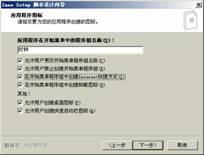 在“應用程序在開始菜單中的程序組名稱”里輸入您想建立程序的名稱,在下面的選擇框里可以由個人的愛好進行選擇,此處的設置也是inno setup compiler相對于其他制作安裝程序的長處所在。單擊【下一步】按鈕進入“安裝過程中顯示文檔”的界面。這里的設置比較簡單,如果您有“許可協議文件”、“安裝前要顯示的信息文件”及“安裝后要顯示的信息文件”,通過瀏覽按鈕就可以進行添加。單擊【下一步】按鈕直到完成。這時會出現“inno setup編譯器窗口”詢問是否馬上對新建的腳本進行編譯。此時我們選擇否。