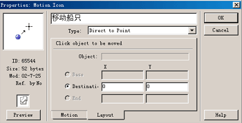 7)單擊船只對象,此時對話框object文本框中出現(xiàn)待運動物體所在的顯示圖標名,操作提示變?yōu)椤癲rag object to destination”,即拖動對象到運動終點。