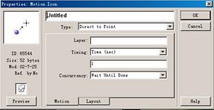 6)選擇動畫圖標屬性設(shè)置對話框中的motion標簽,出現(xiàn)motion選項卡。在type下拉列表框中選擇direct to line在timing下拉列表框中選擇時間,并把時間設(shè)定為1;在concurrency下拉列表框中選擇concurrency選項,設(shè)定同步方式。