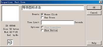 | 等待圖標是讓程序暫停執(zhí)行,直到條件滿足后程序才繼續(xù)運行。在本例中,我們設(shè)定程序等待鼠標單擊后繼續(xù)執(zhí)行。選擇mouse click復(fù)選框,單擊ok按鈕即可。 | ![]() |