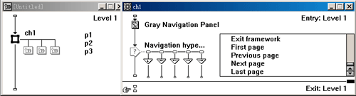 框架圖標(biāo)是由兩部分構(gòu)成,即entry部分和exit部分。其中entry部分是進(jìn)入該框架結(jié)構(gòu)中任何一頁時(shí)必須要執(zhí)行的程序。例如,我們在entry部分放置一個(gè)顯示圖標(biāo),顯示圖標(biāo)里顯示一幅背景會(huì)出現(xiàn),則該背景在該框架圖標(biāo)的所有頁中。而exit部分是退出該框架結(jié)構(gòu)時(shí)必須要執(zhí)行的程序。