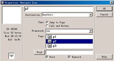 4)通過查找來跳轉(zhuǎn)到指定頁 有時(shí)我們并不想從頭到尾地來瀏覽一個(gè)電子出版物的所有內(nèi)容,我們只關(guān)心自己感興趣的內(nèi)容。這時(shí),通過查找來跳轉(zhuǎn)到指定頁就很有作用。例如,當(dāng)用戶想查找關(guān)于"動(dòng)物"的主題詞,可以在查找對話框中輸入"動(dòng)物",則autnorware將程序中所有含有"動(dòng)物"主題詞的頁面標(biāo)題以列表的形式顯示在查找窗口中,用戶可以雙擊列表中反面的標(biāo)題查閱該頁中的內(nèi)容。 雙擊導(dǎo)航圖標(biāo),出現(xiàn)導(dǎo)航圖標(biāo)屬性設(shè)置對話框。在導(dǎo)航圖標(biāo)屬性設(shè)置對話框destination下拉列表中選擇find就將該導(dǎo)航圖標(biāo)設(shè)置為具有通過查找關(guān)鍵字來跳轉(zhuǎn)到指定頁的功能。在該對話框中: (l)設(shè)置鏈接返回方式 - 選擇jump to page選項(xiàng),將直接終止當(dāng)前程序,跳轉(zhuǎn)到指定頁面位置開始執(zhí)行。