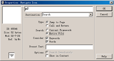 (4)設(shè)置搜索特性 選擇search immidately復(fù)選框,程序執(zhí)行此導(dǎo)航圖標(biāo)時(shí)將自動(dòng)直接搜索預(yù)設(shè)字符。選擇show incontext復(fù)選框,程序?qū)@示匹配對象的上下文。 導(dǎo)航圖標(biāo)設(shè)置為查找跳轉(zhuǎn)到指定頁功能后,程序運(yùn)行到此導(dǎo)航圖標(biāo)將彈出查找窗口。 在word/phrase文本輸入框中輸入一個(gè)單詞或短語關(guān)鍵詞,然后單擊find按鈕或按回車鍵,則authorware將開始搜索包含此關(guān)鍵詞的頁面.并將搜索到的頁面名稱顯示在page列表框中。用戶項(xiàng)查看某頁,只要用鼠標(biāo)雙擊列表框中的這頁標(biāo)題就可以直接進(jìn)入該頁;或者用鼠標(biāo)單擊該頁的標(biāo)題使其處于選中狀態(tài),然后單擊go to page按鈕也可以進(jìn)入該頁。在查找到的頁面中,正文中所含的關(guān)鍵詞將以彩色高亮顯示出來。 | 程序運(yùn)行后所彈出的查找窗口上都顯示英文標(biāo)題,我們需要修改程序設(shè)置,將查找窗口顯示成中文標(biāo)題,這樣可以方便最終用戶對本軟件的使用,因?yàn)椴⒎撬械某绦蚴褂谜叨际煜び⑽模性诔绦蛑幸M量避免使用英文提示。而且此處使用英文界面與整個(gè)程序的風(fēng)格也不一致。修改查找窗口的標(biāo)題選擇modify-file-navigation setup命令,彈出導(dǎo)航設(shè)置對話框。 |  |