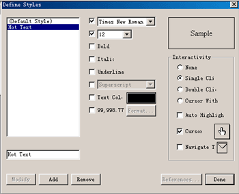 在導(dǎo)航設(shè)置對話框中,將各項(xiàng)標(biāo)題改成相對應(yīng)的中文,其中選擇highlightfound words復(fù)選框?qū)⒃诤胁檎谊P(guān)鍵字的頁面中將關(guān)鍵字用指定的顏色高亮度地顯示出來。將各項(xiàng)標(biāo)題改變以后,再運(yùn)行程序,可以看到查找窗口上都已顯示中文標(biāo)題了。 5)通過計(jì)算跳轉(zhuǎn)到某一頁 通過計(jì)算跳轉(zhuǎn)到某一頁就是通過變量或表達(dá)式來控制導(dǎo)航圖標(biāo)的跳轉(zhuǎn)目標(biāo)頁。在導(dǎo)航圖標(biāo)設(shè)置對話框destination下拉列表中選擇calculate,在icon expression文本框中輸入需要跳轉(zhuǎn)到的頁面名變量或表達(dá)式,就將該導(dǎo)航圖標(biāo)設(shè)置成通過計(jì)算跳轉(zhuǎn)到相應(yīng)頁的功能。 9.6.3 熱字的制作 在超文本文檔中,熱字是超文本主要實(shí)現(xiàn)手段。在authorware中提供了一種制作熱字的方法,其實(shí)現(xiàn)手段主要還是利用導(dǎo)航圖標(biāo)能夠在頁面問跳轉(zhuǎn)的功能。熱字的制作可按如下步驟。 l)選擇text-define text命令,出現(xiàn)文字風(fēng)格對話框。 2)定義一種新的文字風(fēng)格,命名為“hot text”,如圖所示。 為了將熱字與普通文本在形式上分開來,一般情況下,熱字以一定的顏色或下劃線的形式出現(xiàn)。另外,當(dāng)鼠標(biāo)移動(dòng)到熱字所在的區(qū)域,此時(shí)鼠標(biāo)會(huì)變成一個(gè)小手,單擊一下(或雙擊)激發(fā)交互相應(yīng)進(jìn)行導(dǎo)航鏈接。根據(jù)這些要求,我們按圖所示來設(shè)置字體風(fēng)格。其中interactivity選項(xiàng)欄是設(shè)置效率的關(guān)鍵部分,即給字體賦予交互性。 |
