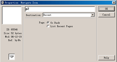 3)跳轉(zhuǎn)到最近到過的頁 使用過網(wǎng)絡(luò)瀏覽器的人都會(huì)熟悉瀏覽器上的“后退”功能,后退功能將一步步回退到以前瀏覽過的頁面。authorware導(dǎo)航圖標(biāo)設(shè)定為跳轉(zhuǎn)到最近到過的頁就是實(shí)現(xiàn)這種“后退”功能。 在導(dǎo)航圖標(biāo)設(shè)置對話框中destination下拉列表中選擇recent,對話框中出現(xiàn)兩種選擇: 選擇go back就是一步步回退到以前瀏覽過的頁面。 選擇list recent pages,就是將最近到過的頁面依次排列。在一個(gè)特定的歷史記錄窗口中,用鼠標(biāo)雙擊該窗口中所列的頁面名就跳轉(zhuǎn)到此頁。 |  |