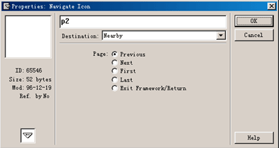 雙擊框架結(jié)構(gòu)內(nèi)的導(dǎo)航圖標(biāo),出現(xiàn)導(dǎo)航圖標(biāo)屬性設(shè)置對話框,如圖所示, 在導(dǎo)航圖標(biāo)屬性設(shè)置對話框中,在destination下拉到表框中選擇導(dǎo)航圖標(biāo)鏈接跳轉(zhuǎn)目標(biāo)頁。導(dǎo)航圖標(biāo)實(shí)現(xiàn)的頁間鏈接跳轉(zhuǎn)的功能有:
