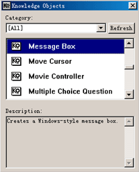 authorware 5中已經附帶有許多各種功能的智能對象,選擇windows-knowledge objects菜單命令,彈出智能對象窗口。