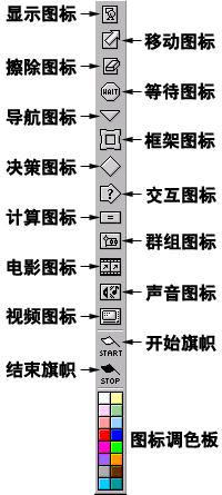 authorware的使用界面十分友好,提供了這樣一個功能:當把鼠標移向圖標欄的某一設計圖標的上方時,在鼠標的下方將會出現該圖標的名稱。