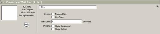 根據以上的分析,首先在“繪制時針”設計圖標之后插入一個【等待】設計圖標,將其命名為“1 sec”。打開該設計圖標,進行如圖3-64所示的設置:關閉【key press】和【show button】復選框,同時設置程序暫停時間為1秒。