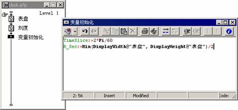 表示秒針轉動一次的弧度是2*pi/60,這是因為秒針轉動一周(經過2*pi弧度)需要擺動60次。表達式displaywidth@"表盤"和displayheight@"表盤"分別計算出表盤的高度和寬度,程序語句: