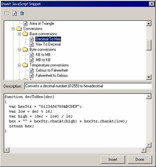 當編寫js代碼時,單擊【運算】窗口的【插入片段】按鈕,會打開insert javascript snippet對話框(如圖3-53所示),其中以函數(shù)方式提供了大量js代碼片段,從進制轉(zhuǎn)換到數(shù)組冒泡排序算法應(yīng)有盡有。這些函數(shù)可以看成是對authorware系統(tǒng)函數(shù)的補充,除了可以在使用js編程時直接調(diào)用之外,在利用aws編程時也可以通過函數(shù)evaljs()對這些js函數(shù)進行調(diào)用。例如以下aws代碼: