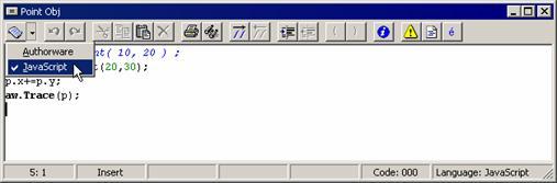 只能在【運算】設計圖標中使用js代碼。在【運算】窗口中輸入js代碼的過程與輸入aws代碼的過程類似,但在輸入js代碼之前,必須利用【運算】窗口工具欄中的【語言】按鈕,將當前語言選擇為javascript,如圖3-51所示。【語言】按鈕以authorware 7.0的標志表示aws語言,同時運算窗口狀態欄的右側也會顯示出當前選用的語言。
