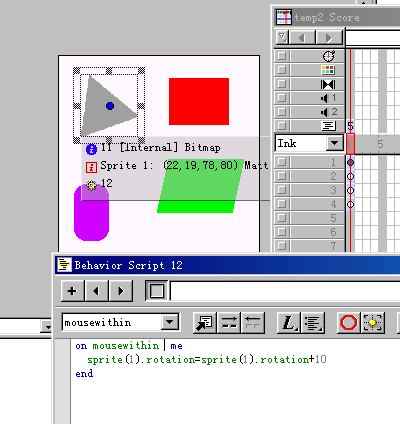 第一個鼠標移動到三角sprite上會不斷旋轉.第二個鼠標移動到紅色方塊上方塊會不斷往下走.鼠標移動到第三個sprite紫色方塊上,方塊會自動慢慢淡化消失.鼠標移動到第四個綠色方塊sprite上方塊會自動變形.這些動作沒有一個是使用時間軸制作的,都是使用lingo語句編寫的.首先我們來看看他們的核心語句.