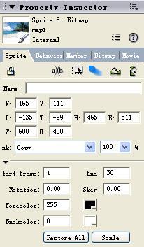 l property inspector (屬性檢視器)是最常用的檢視器,它用于顯示選中對象的大小、顏色、位置等等屬性。同時根據選中對象的不同,屬性檢視器將顯示多個標簽頁。如圖 2-16 ,對于舞臺上的圖像精靈,屬性檢視器顯示了精靈的位置信息。
