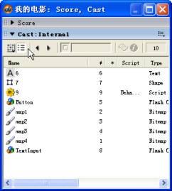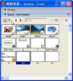 組成電影的每一個元素——圖像、聲音、腳本、 flash 動畫等都可以看作是參與演出的演員。演員窗口是你存儲和組織演員的地方,默認情況下,演員窗口以列表方式顯示窗口中的演員,如圖。但是大家更愿意以縮略圖方式顯示窗口中的演員,如圖。你可以單擊窗口上側的 cast view style 按鈕,在列表方式和縮略圖方式之間切換。如圖 2-14 , 2-15