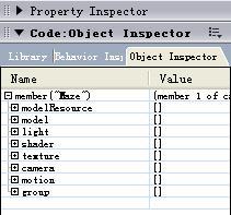 l object inspector (對象檢視器)與屬性檢視器有著明顯的不同,屬性檢視器處理的是某個具體的對象,如圖像或者聲音,對象檢視器處理的是變量、數組等出現在 lingo 中的編程對象。也可以用來調整 3d 演員的一些高級屬性。如圖 2-18