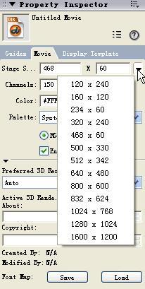 單擊舞臺(tái)窗口中的空白處,此時(shí)屬性檢視器將顯示與電影相關(guān)的屬性。按下屬性檢視器“ movie ”選項(xiàng)卡,在 stage size 后面輸入舞臺(tái)的寬和高,讀者也可以在后面的下拉列表中直接選取,這里列出了常用的舞臺(tái)設(shè)置(如圖 2-30 )。選擇 468 * 60 的屏幕設(shè)置。這樣的設(shè)置通常應(yīng)用來制作 banner 。