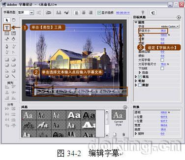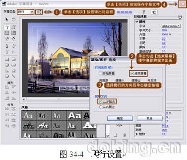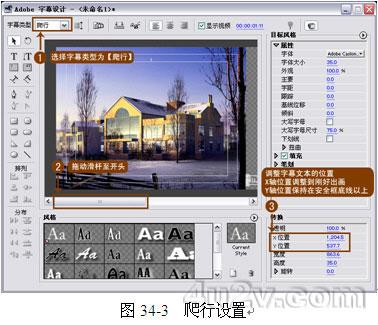 4、 編輯字幕。輸入文本并且對其進行編輯調整和爬行設置,如圖 34-2 至圖 34-4 所示。