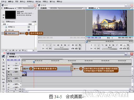5、 合成畫面。完成各項的設置后,將字幕文件進行保存,保存后的字幕文件將自動調進 premiere 的項目窗口中,將其拖入時間線編輯軌道后與背景層疊加,如圖 34-5 所示。