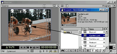 可以把項目窗口中的某一段視頻素材直接拖動至時間軸上,如果希望預覽或精確地剪切素材,就要用到監示窗,方法是將視頻素材拖入監示窗口的源素材(source)預演區,另外,在項目窗口雙擊視頻或音頻素材,也能取到同樣的效果,如圖5所示。