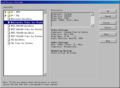 打開premiere 6.0,就會出現預設方案(load project)對話框,如圖1所示。
