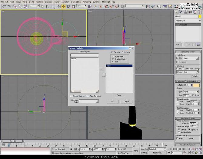 在頂視圖創(chuàng)建一個泛光燈,名為flameOmni01 ,強度倍增 :5 . RGB :255.225.168. 衰減模式: 平方反比 .這樣就將衰減效果顯示出來了,并且衰減的開始為0.8(大概為火焰寬度的一倍大小的位置).再勾選遠衰減 開始為0 結束為 30 .高級特效參數(shù)欄中 ,可比度 值為50 .在整體參數(shù)欄中去把火焰對象添加進排除列表中去. (使用平方反比的衰減模式是希望取消燈光本身所具備的光線的明確方向?qū)傩?這樣使從火焰發(fā)出的光線能夠比較真實.又因為使用了平方反比,所以明度會降低,因此還需要復制多個相同的出來使得光線加強. 遠衰減建議設置為0 要不畫面就過暴了)