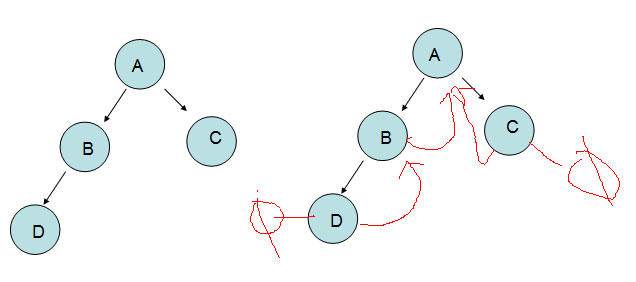 <2> 接著就是“B節點”,他的左指針不為空,所以就不管了,但是他的“右指針”空閑,根據規則“B結點“的右
