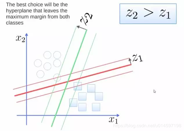 要將兩類分開,想要得到一個超平面,最優的超平面是到兩類的margin達到最大,margin就是超平面與離它最近一點的距離,如下圖,Z2>Z1,所以綠色的超平面比較好。