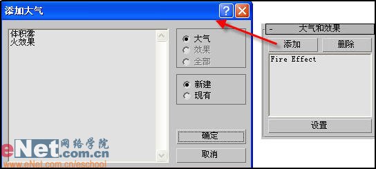 3、打開“大氣和效果”卷展欄,點擊“添加”按鈕,彈出“添加大氣”窗口,選擇“火效果”,然后點擊確定。如圖6所示。