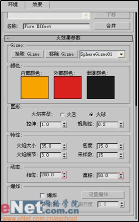 4、在列表中選中“fire effect”項,然后點擊“設置”按鈕,調出環境和效果窗口,打開“火效果參數”卷展欄,修改其參數,如圖7所示。