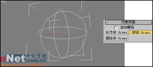 1、單擊“創建”命令面板中的“輔助對象”按鈕,進入其創建命令面板,在下拉列表中選擇“大氣裝置”項,在“對象類型”卷展欄中點擊“球體gizmo”按鈕,在視圖中創建一球體框spheregizmo01,如圖3所示。