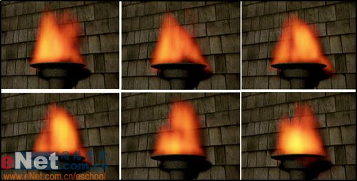 2、為fpoint01開啟陰影貼圖功能,同時為火炬賦予一金屬材質,為plane01指定一背景貼圖,點擊工具欄上的“渲染場景對話框”按鈕,確定動畫范圍0-100,于是開始動畫渲染,連續截圖如圖10所示。