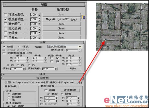 1、點擊工具欄上的“材質編輯器”按鈕,打開其面板,選擇第一個樣球,打開“貼圖”卷展欄,單擊“漫反射顏色”后的“none”按鈕,打開“材質/貼圖瀏覽器”面板,選擇“新建”單選項,然后在左邊列表中雙擊“位圖”貼圖,為其指定一圖片,如圖7所示,將此材質賦予text01。