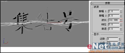 小提示:“振幅1”和“振幅2”值分別用來定義波浪中間和兩邊的振幅;“波長”值用來設定波浪的波長;“顯示”欄中的參數用來設定波浪在視圖中的顯示模式,與最終渲染效果無關。