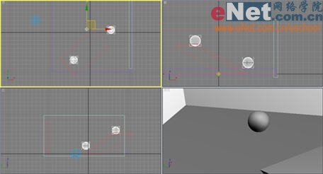 1、啟動(dòng)3dmax9.0,單擊“創(chuàng)建”命令面板,點(diǎn)擊“幾何體”按鈕,在下拉列表框中選擇“標(biāo)準(zhǔn)基本體”項(xiàng)。點(diǎn)擊“長方體”按鈕在視圖中繪制四塊長方體box01、box02、box03、box04,大小可以隨機(jī)定義,主要是用來搭建兩個(gè)球體運(yùn)動(dòng)一個(gè)場景,效果如圖1所示。