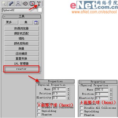 5、單擊“工具”命令面板進(jìn)入程序命令面板,單擊“reactor(動(dòng)力學(xué))”按鈕進(jìn)入動(dòng)力學(xué)屬性面板,展開“properties(屬性)”卷展欄,然后分別選擇兩個(gè)球體并定義其參數(shù),如圖5所示。