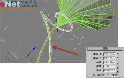 8、點(diǎn)擊“創(chuàng)建”命令面板中的“圖形”按鈕,進(jìn)入其創(chuàng)建面板,單擊“螺旋線”按鈕,在視圖中繪制一螺旋線helix01,調(diào)整其參數(shù),作為花的藤蔓,如圖8所示。