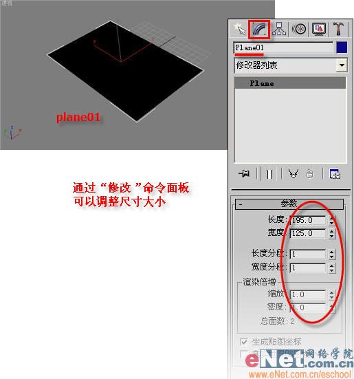 啟動3dmax9.0,單擊“創建”命令面板,點擊“幾何體”按鈕,在下拉列表框中選擇“標準基本體”項。點擊“平面”工具按鈕,在“頂部”視圖中創建平面plane01,如圖1所示。