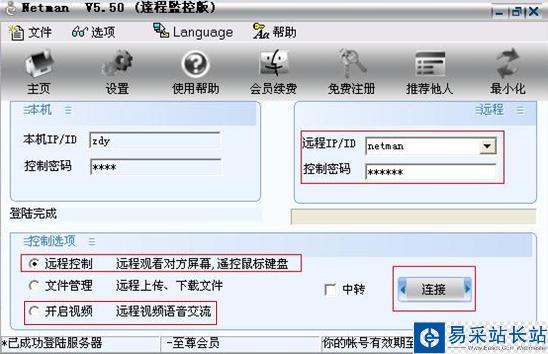 5、遠程監(jiān)控 使用會員登錄后,在“遠程IP/ID”處輸入遠程電腦上登錄的會員號和控制密碼,選擇“遠程控制”,點擊“連接”(如圖4),即可看到對方桌面(如圖5),對方是在上網(wǎng)聊QQ,還是玩網(wǎng)絡游戲,都看得一清二楚! 6、開啟攝像頭