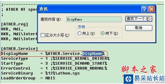2.打開.inf文件,按Ctrl+F搜索關(guān)鍵字“DispName”,找到語句“DisplayName=%X.Service.DispName%”(X代表不同芯片商)。