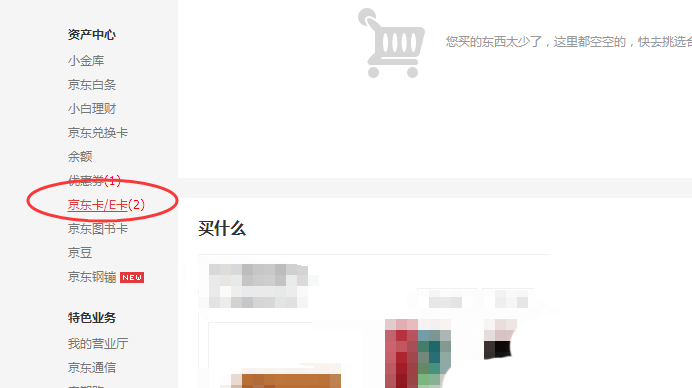 2、在左側(cè)菜單中找到京東卡/E卡,并點(diǎn)擊進(jìn)入。