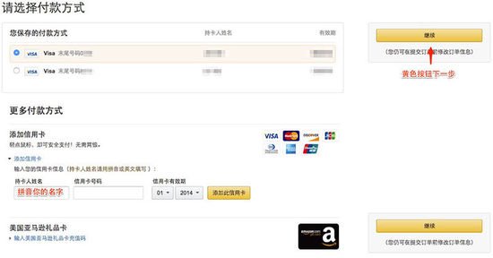 接下來是支付方式了。放心,在后面還有修改的機(jī)會(huì)。你必須提供一張可以透支的信用卡,銀聯(lián)的就可以,不用非得是visa,master。如果是新添加的信用卡,那么下一步還會(huì)需要你選擇信用卡關(guān)聯(lián)的賬單地址,選擇跟你之前添加的收貨地址一樣就行了。