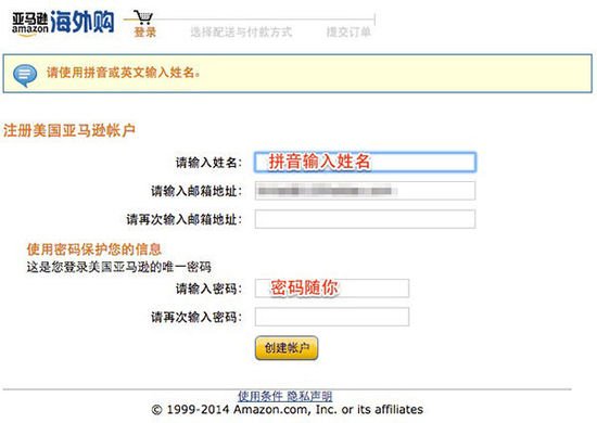 創(chuàng)建一個(gè)新的美亞賬號(hào),你只需要拼音輸入名字,你的郵件地址和準(zhǔn)備用在美國亞馬遜的登錄密碼即可。