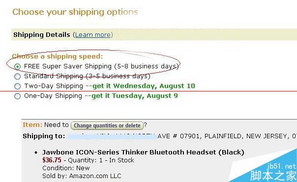 選擇免費的5到8天快遞后點擊按鈕Continue繼續。如果你確認自己的Amazon Prime服務有效,可以選擇“Two-Day Shipping”,兩天就能寄到美國的轉運地址了。