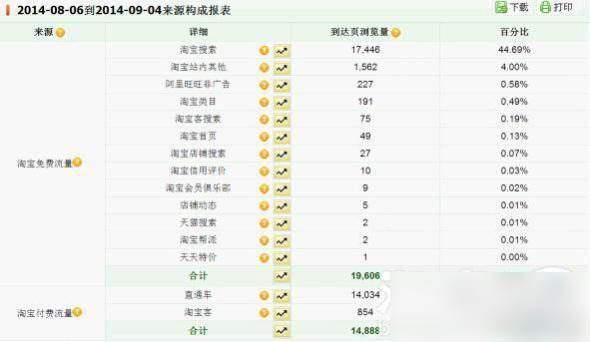 從這個數據可以看到自己店鋪的流量到底是從哪里來的,免費的占多少,付費的占多少,比例是否健康,如果免費的占比較少,那就應該多下點功夫在自然搜索優化上了。