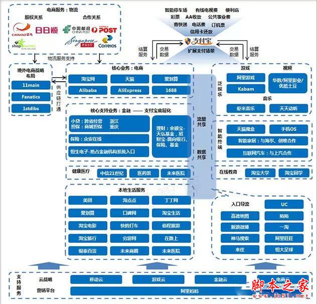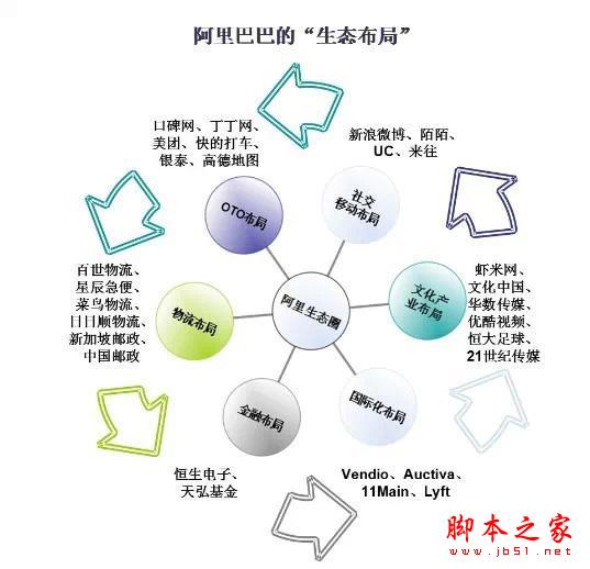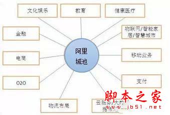 阿里主城:電商;衛星城布局包括:云計算服務、倉儲物流、支付、電商業務、O2O、移動端、文化娛樂和數字媒體、在線教育、健康醫療產業、金融業。