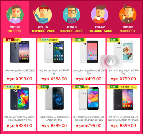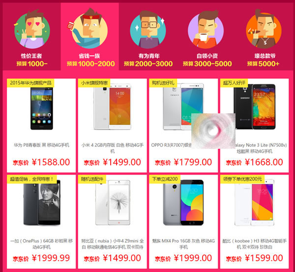 2、省錢一族,預算1000-2000:華為P8、小米4、OPPO R3、三星Note3 Lite、一加手機、努比亞小牛4、魅族MX4 Pro等爆品皆在列。立刻參與