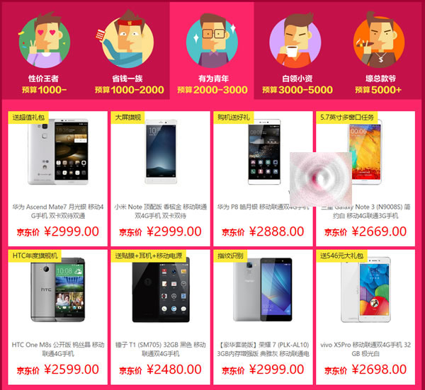 3、有為青年,預算2000-3000:華為Mate7、小米Note頂配版、華為P8、三星Note3、HTC One M8、錘子手機T1、榮耀7、vivo X5Pro等熱賣機型在列。立刻參與