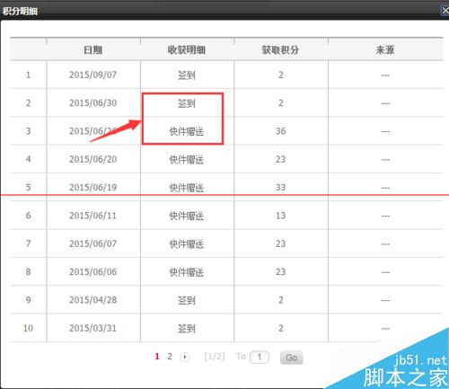 3、進入積分來源明細窗口,主要有兩種獲得途徑,一種就是簽到,還有一種就是通過寄送快件的方式,這也是大家最常使用的方法。